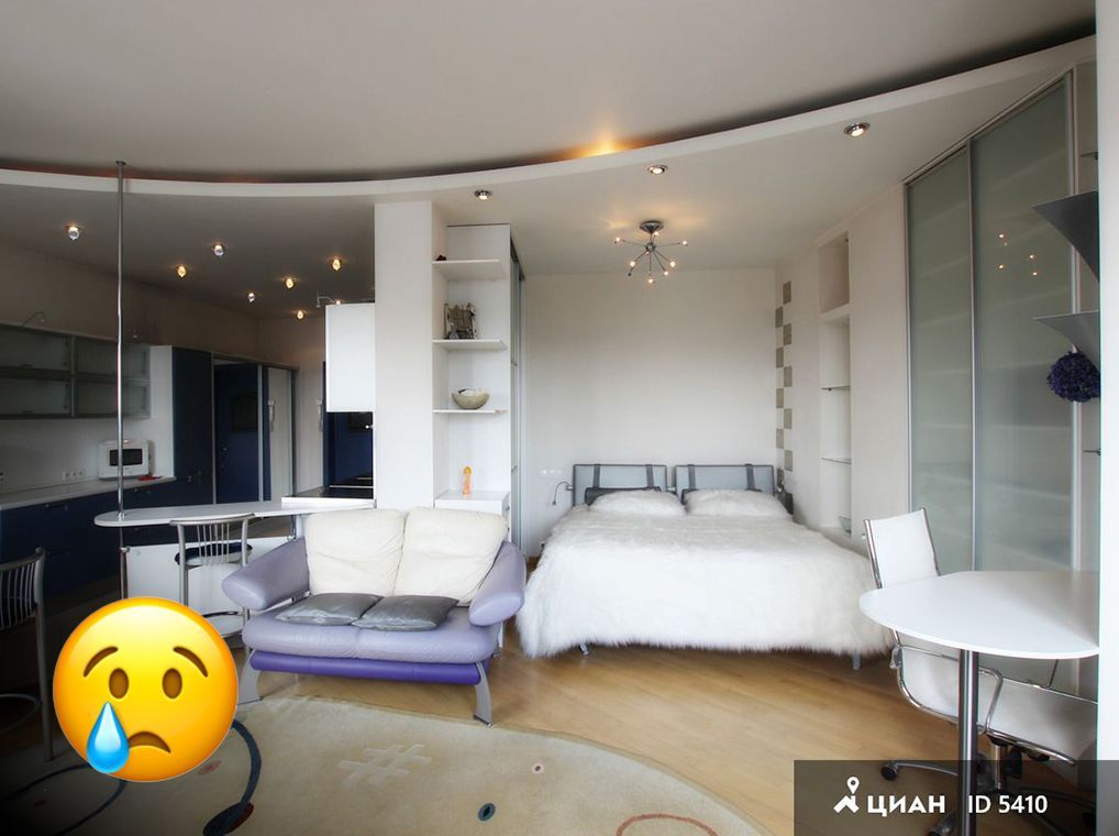 Вот он — идеальный пример всех примеров! В одной комнате все: диван и кровать в миллиметре друг от друга, барные стойки, шкафы-купе, и, конечно, (куда же без них) гипсокартон, натяжной потолок и точечные светильники! Ну очень перегруженный всем дом!