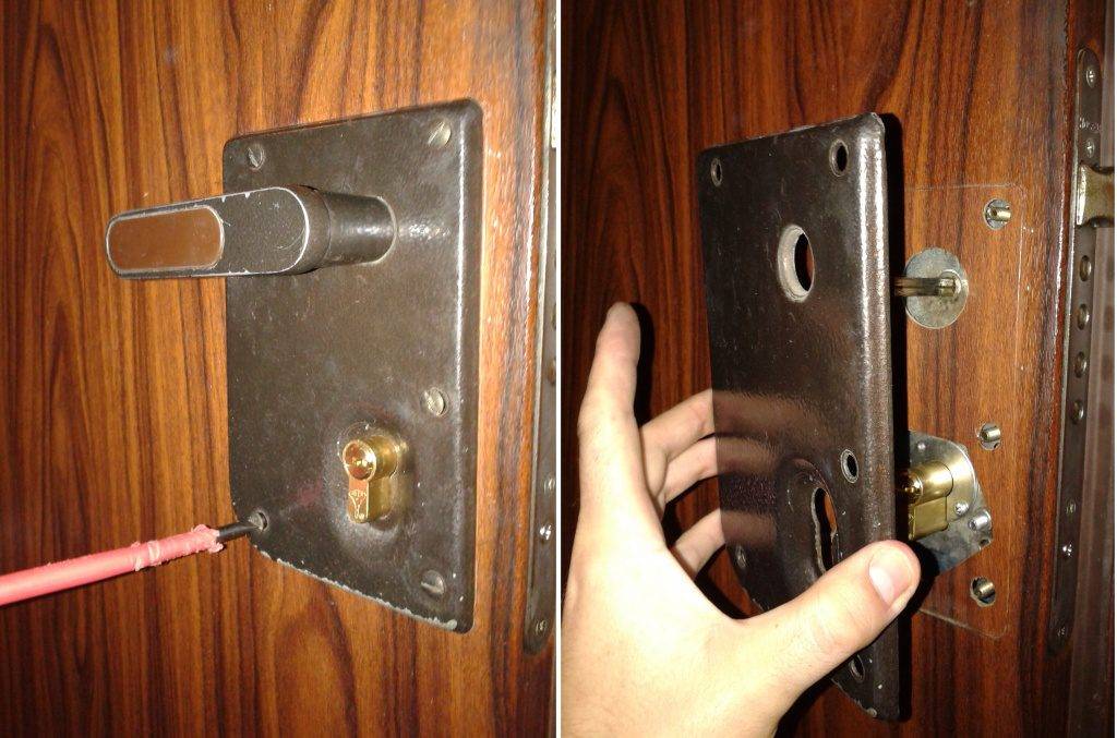 2. С двери снимаются все компоненты, которые могут помешать дальнейшим работам: замок, глазок, ручка, дверные петли с любым вариантом крепления.