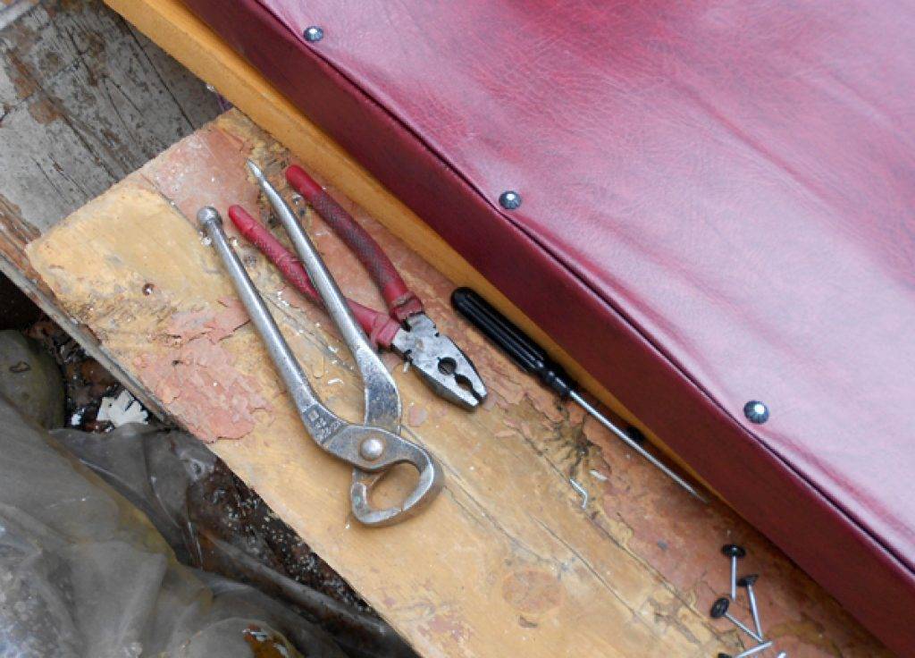 - Если вы хотите украсить, нанесите мелом на обивке геометрический узор и вбейте в углы мебельные гвозди. Можно пойти и дальше, протянув между гвоздями полоски кожи, струну или толстую леску.