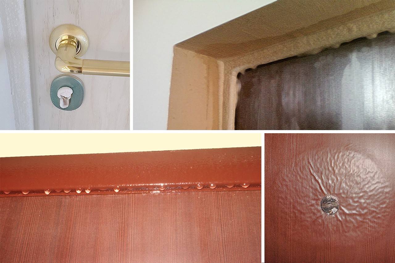 Из-за постоянного воздействия на металлические поверхности влаги и перепадов температур меняется состояние деталей входной двери. Процесс промерзания выражается в набухании полотна, отслаивании кромки, вздувании декоративных панелей (шпона, ламината). Процессы разрушения происходят и с элементами обрамления – коробкой, откосами, наличниками.