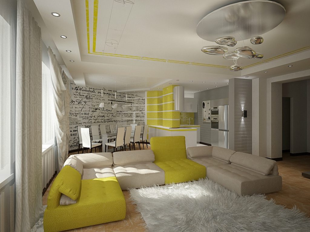 - Если требуется выделить рабочую или столовую зону, над этим участком устраивают второй уровень. Люстра (расположенная в центре уровня) или ряд светильников подчеркнут интересное решение.