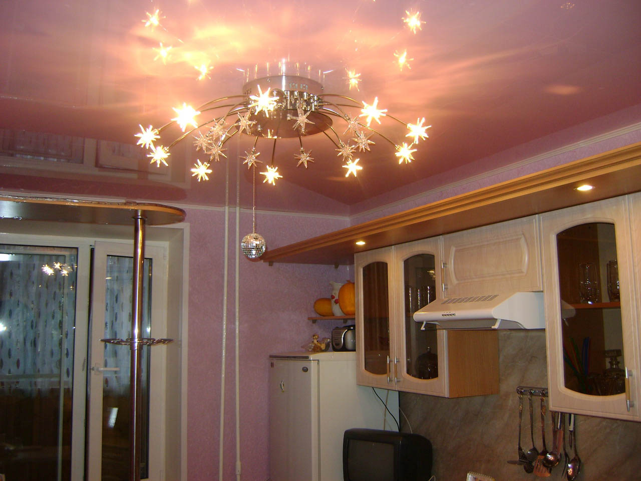 Оригинальные светильники являются элементом стиля кухни. Так, красоту глянцевого потолка удачно подчеркивают хрустальные встроенные светильники. Они создают на потолке узоры и лучи, которые, отражаясь в зеркальной поверхности пленки, создают фантастические картины. Если кухня выполнена в стиле модерн, то потолок может быть и матовым, а светильники — квадратными, ромбовидными либо прямоугольными.