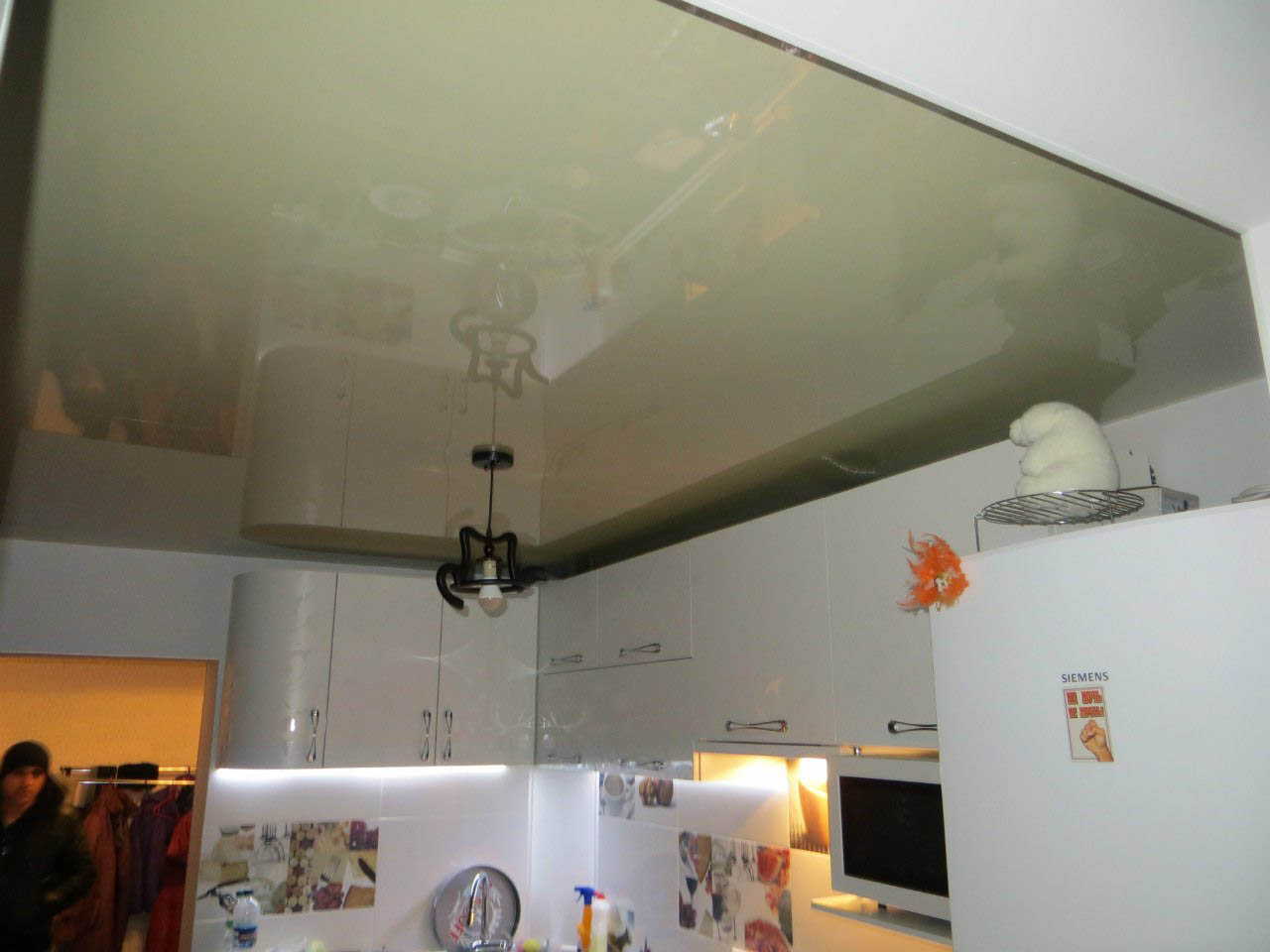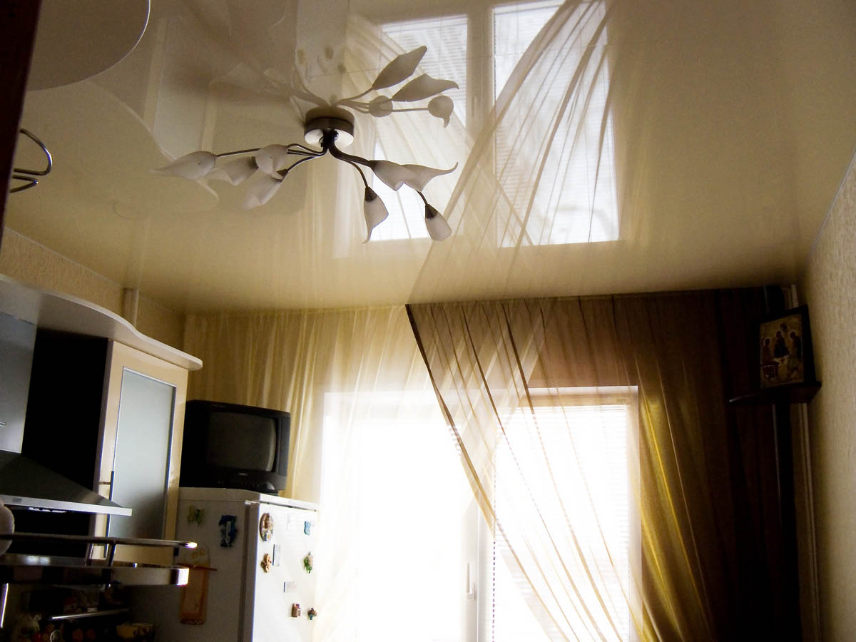 1. Натяжной глянцевый потолок на кухне наиболее практичен: