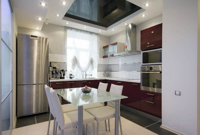 - не просто отражает свет, но и все, что находится на кухне, делая ее более светлой и объемной, а такой потолок – отличным решением для небольших помещений;