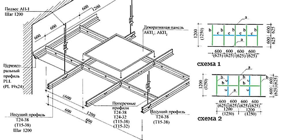 При разметке на потолке отверстий под крепежные узлы подвесов особой точности не требуется: небольшой наклон подвеса легко компенсируется регулировкой его высоты. Пример расчетной схемы потолка армстронг приведен на рисунке.