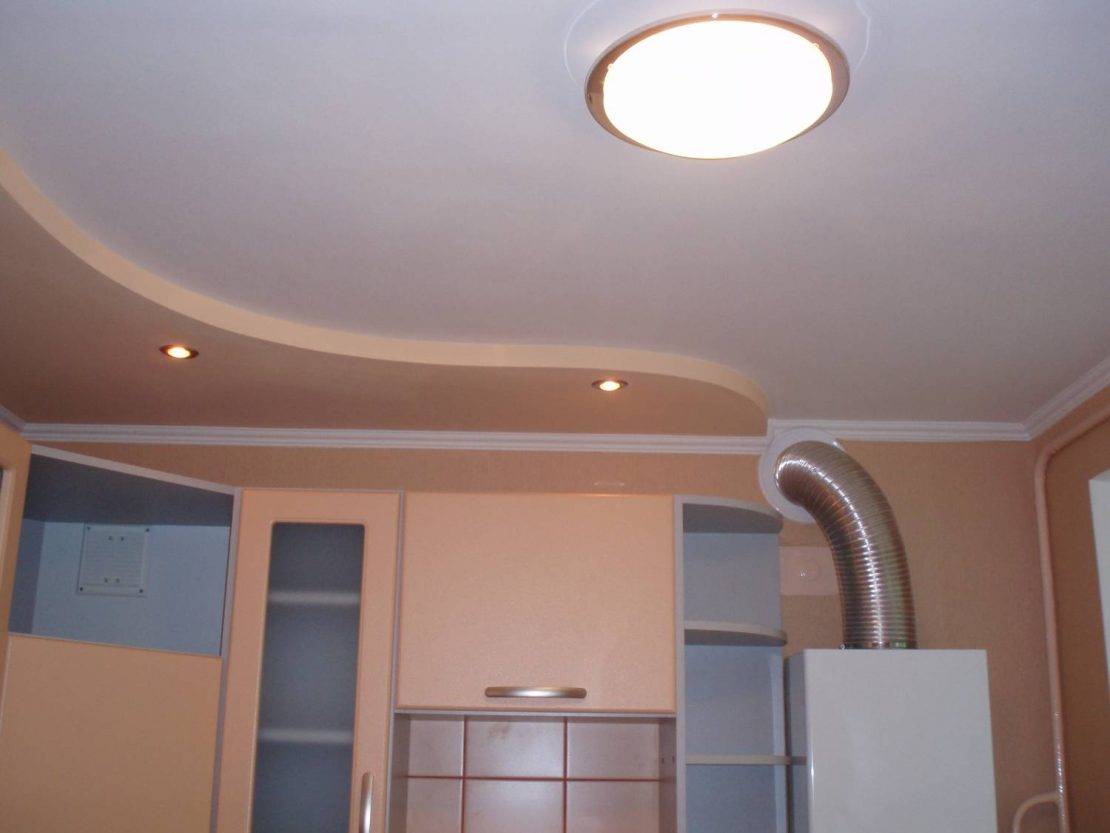 Если можно сделать потолок на кухне опустив его на несколько сантиметров, рассмотрите вариант подвесного потолка из гипсокартона. Этот способ отделки потолка хорош тем, что можно делать многоуровневые конструкции, которые полностью закрывают перекрытие. В зазор между основным и фальшь потолком можно уложить коммуникации — верткороба, проводку.