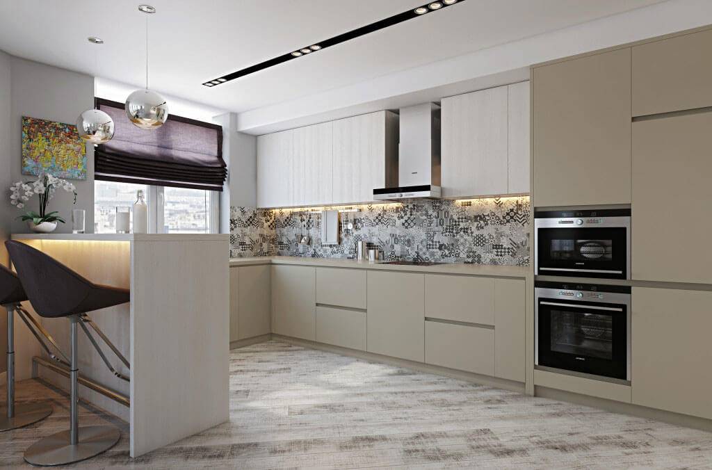 Такое решение станет стильным и современным, а также даст некоторое преимущество: мебель, которая располагается вдали от рабочей зоны, выглядит гораздо чище и опрятнее, меньше нуждается в уборке, а соответственно, и срок ее эксплуатации увеличивается.
