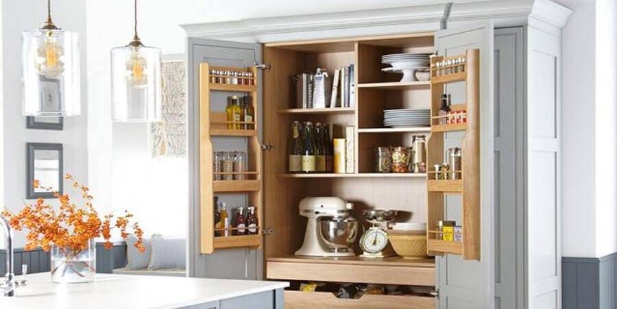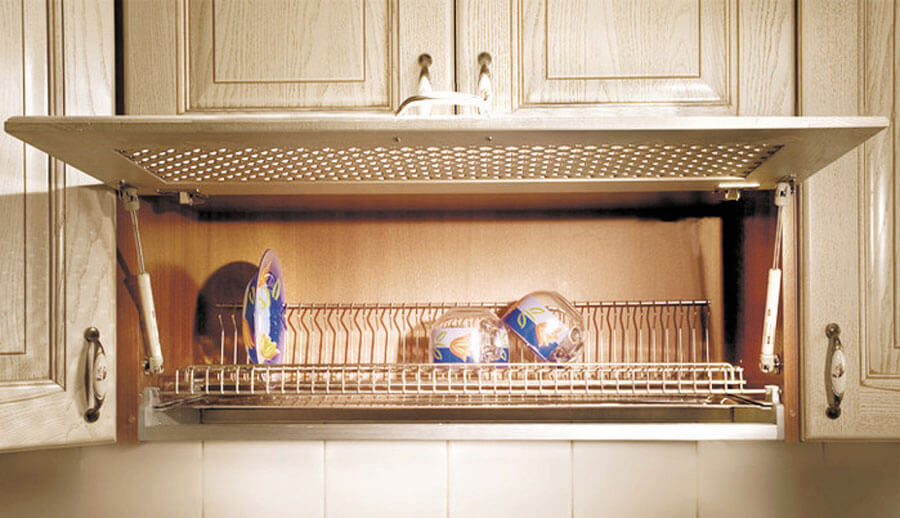 открытые — сами полки. Легко достать необходимый предмет, однако стоит учитывать, что все кухонные принадлежности находятся на виду и покрываются пылью.