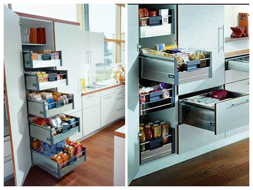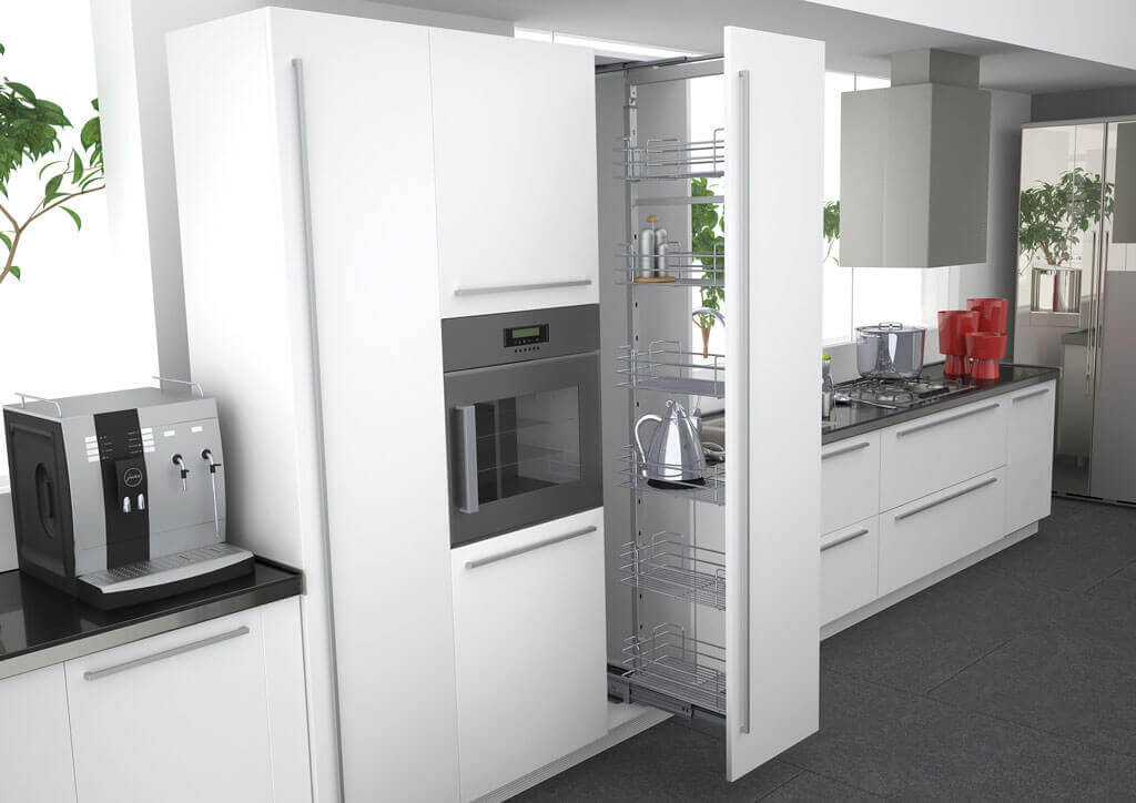 Выдвижные корзины актуальны как для угловой кухни, так и для шкафов-колонн. Загвоздка остается в том, что сложно достать необходимую вещь с верхней корзины, но можно опять же использовать раздвижную стремянку и хранить на верхнем ярусе редко используемые вещи.
