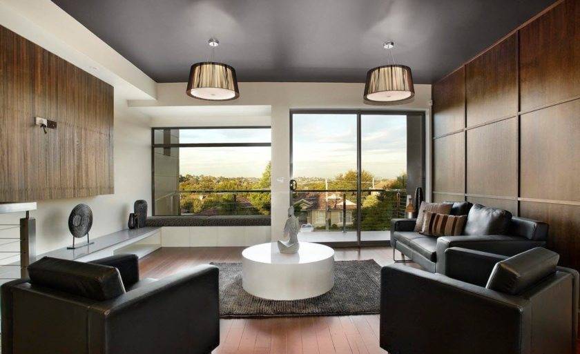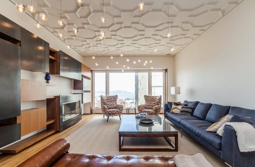 Выполняются такие потолки как из гипсокартона, так из деревянных, пластиковых, металлических панелей. Такой вид оформления гостиной больше подходит для стилей, направленных на натуральность или аскетизм, и придется по вкусу не каждому, но тоже имеет место быть.