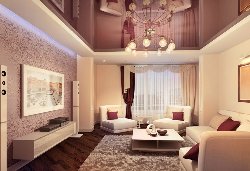 белый глянцевый натяжной потолок, как на фото многочисленных интерьеров – вариант безотказный. Такой цвет зрительно поднимает потолок, глянцевый блеск – расширяет пространство и улучшает освещенность гостиной. Такое решение в одинаковой степени подходит и офисам, и гостиным в квартирах;