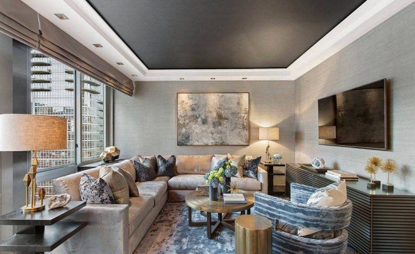 Нестандартные цветовые решения помогут сделать гостиную невероятно привлекательной, выделив при этом потолок в качестве основного акцента в общем убранстве жилой комнаты.