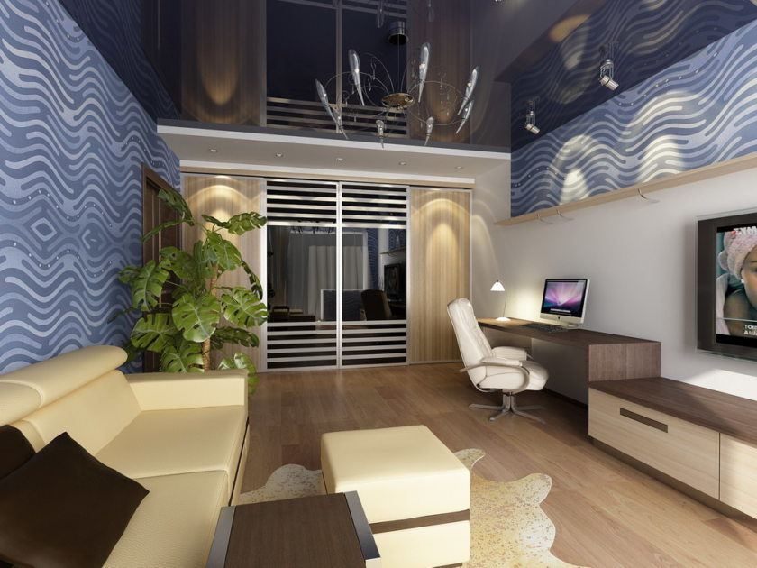 Зонирование гостиной может производиться с помощью потолочного дизайна. Например, в гостиной, совмещенной с кухней, можно установить 2 уровня натяжной конструкции. В этом случае кухонная площадка имеет более низкий потолок, при этом на нем применяется полотно иного цвета и используется другая система освещения. Визуально кухня отделяется от остальной части помещения. Пример двухуровневого потолка показан на фото 3.