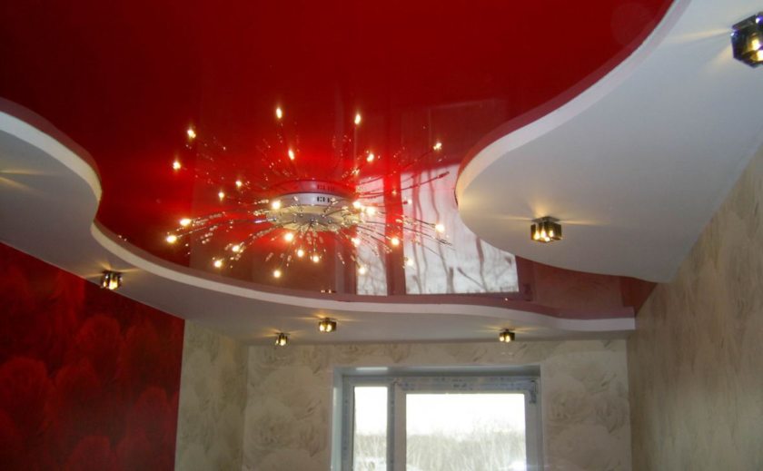 - красный – полотно настолько яркого цвета, как правило, комбинируется с белой гипсокартонной конструкцией. Обязательное условие – глянцевый блеск.
