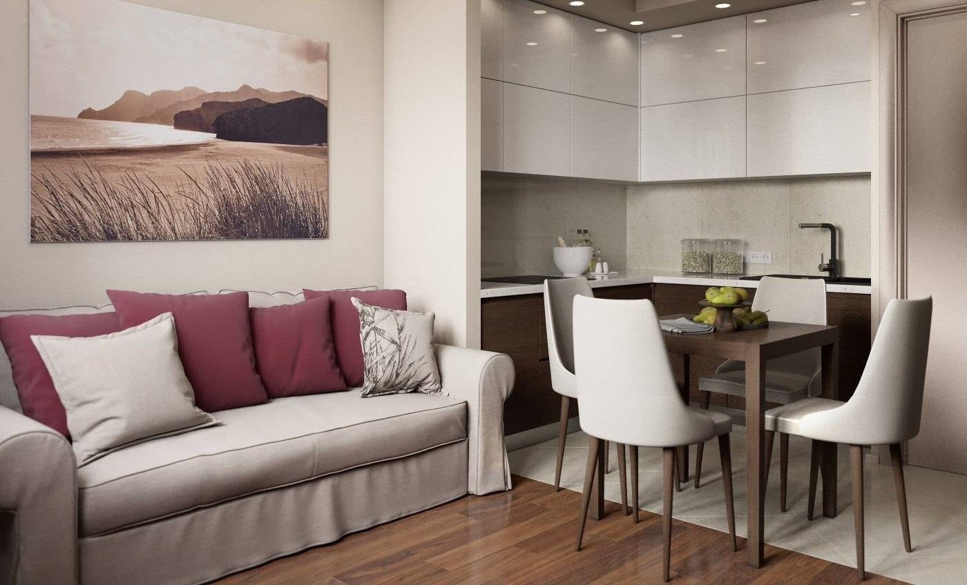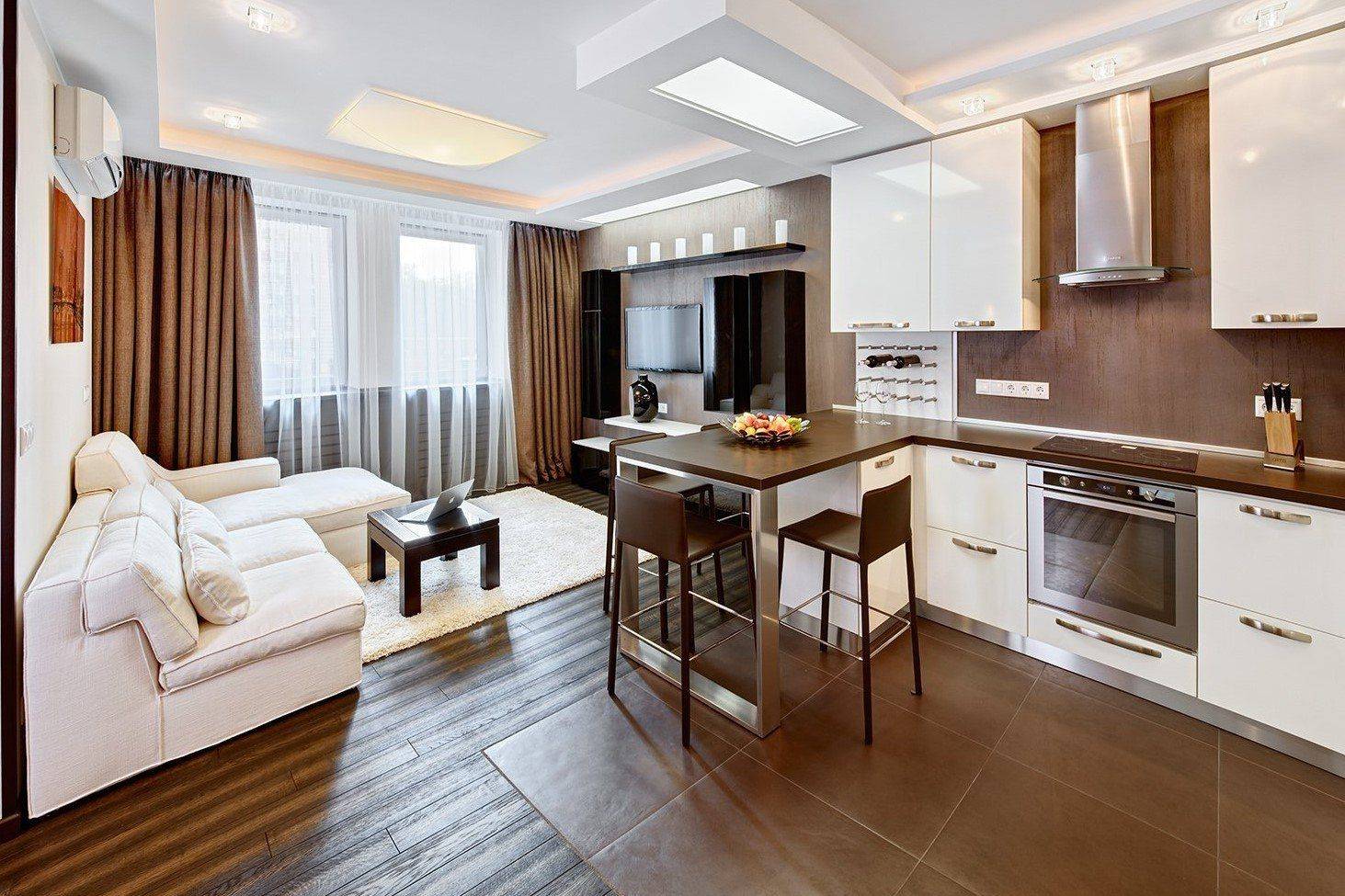 Не в любой квартире получится объединить кухню и гостиную. Одно из главных требований – достаточно места. Если совмещать слишком маленькие комнаты, не удастся добиться главного эффекта – ощущения свободы и легкости. Скорее наоборот, захламленность кухни будет распространяться еще и на зону отдыха. При скромных размерах делают один натяжной потолок в кухне-гостиной. Сложные конструкции, многоярусный потолок, обилие разных материалов будут неуместны.