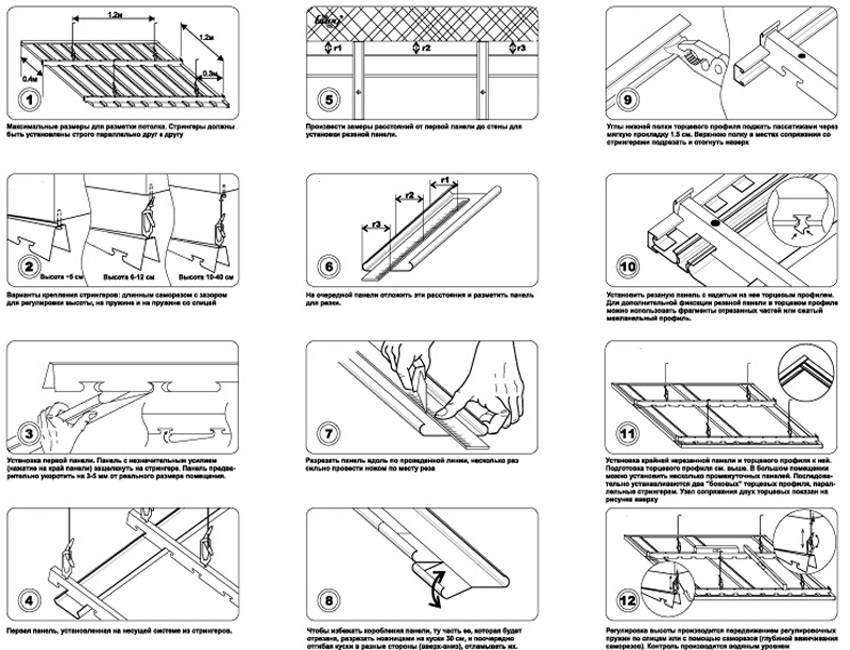 Монтаж плит делают на заранее установленный устойчивый каркас из металла, методом стык в стык, что не подразумевает образования видимых швов между плитами конструкции. Эстетичная привлекательность зависит от расположения панелей, характеристик расходных материалов и грамотной планировки потолочного пространства в ванной комнате.