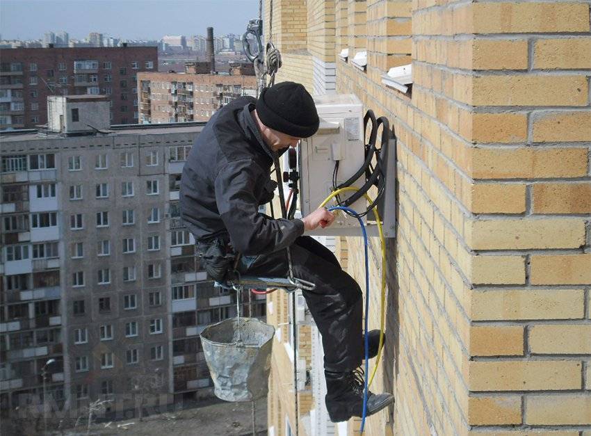 При установке наружного блока кондиционера своими руками на стене рядом с окном, обдумайте высоту его монтажа. Можно расположить верхнюю поверхность блока вровень с верхней кромкой окна. В этом случае, высунувшись из окна и застраховавшись, можно будет проводить работы стоят на подоконнике. Второй вариант — нижнюю кромку выровнять вровень с нижней границей оконного проема. Тут можно будет лечь животом на подоконник, но достать до места выхода патрубков не получится. То есть, все-таки придется вызывать промышленных альпинистов.