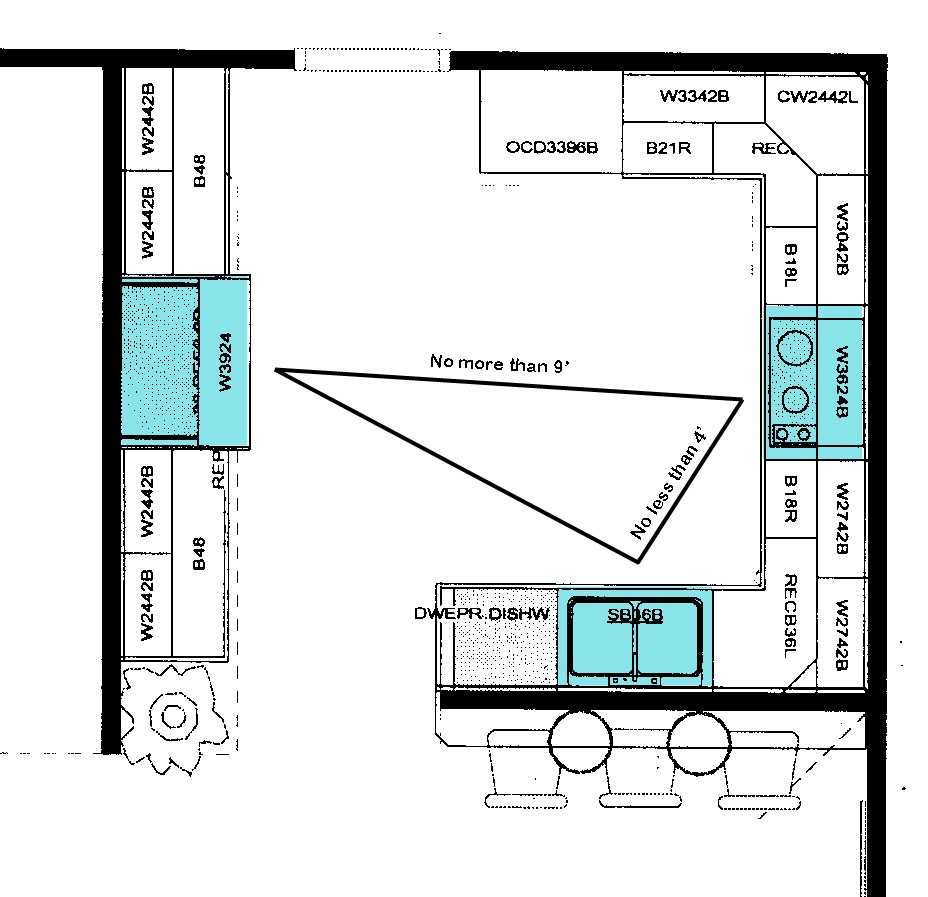 Если брать во внимание правила зонирования кухни, то можно выделить базовое правило планировки кухни — правило рабочего треугольника.