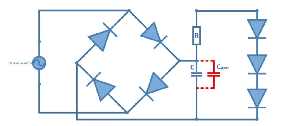 Для того, чтобы снизить коэффициент пульсации, достаточно либо добавить к существующему конденсатору дополнительный (Сдоп на схеме), либо полностью заменить штатный элемент схемы на деталь с большей в 1,5 раза емкостью. Ограничение зависит от габарита нового конденсатора и опыта специалиста, так как операция замены происходит в цоколе. Установка дополнительного элемента вне лампы не удобна для эксплуатации.