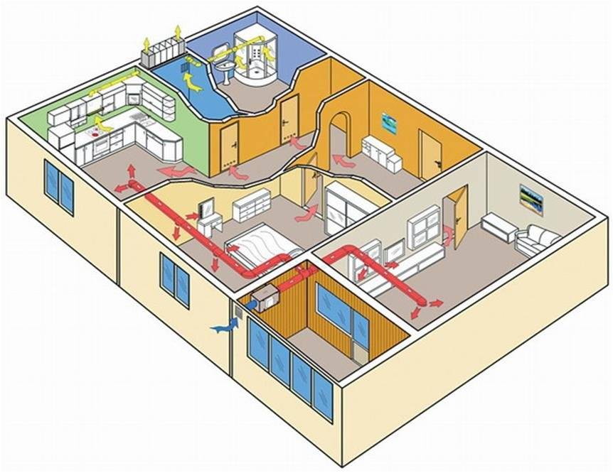 Для организации разводки используют пластиковые трубы. Дальше в работу вступает физика — более теплый комнатный воздух под давлением и за счет силы тяги вытягивается наружу, более холодный уличный воздух поступает в комнаты по специально-сделанным каналам, либо естественным образом (дверные проемы, открытые окна и т.д.).