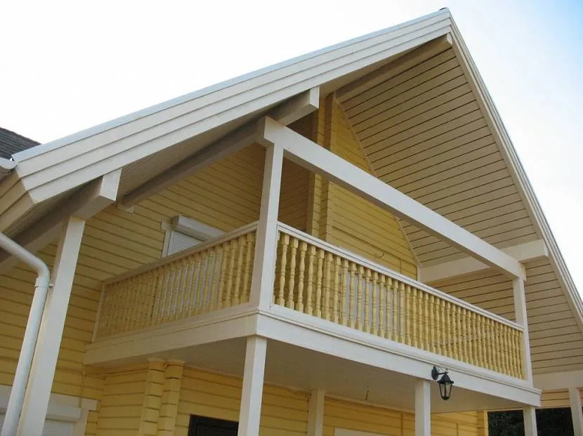 Таким образом, освобождается место для расположения балкона. Фронтон при этом должен сдвигаться на глубину пристраемого балкона. Следовательно, часть конструкции между нижними и чердачными этажами будет выполнять функцию пола на балконе, а выходящий вперед край кровли у фронтона – его навеса. В таком типе постройки ширина балкона должна соответствовать ширине здания, как и в случае присоединения лоджии.