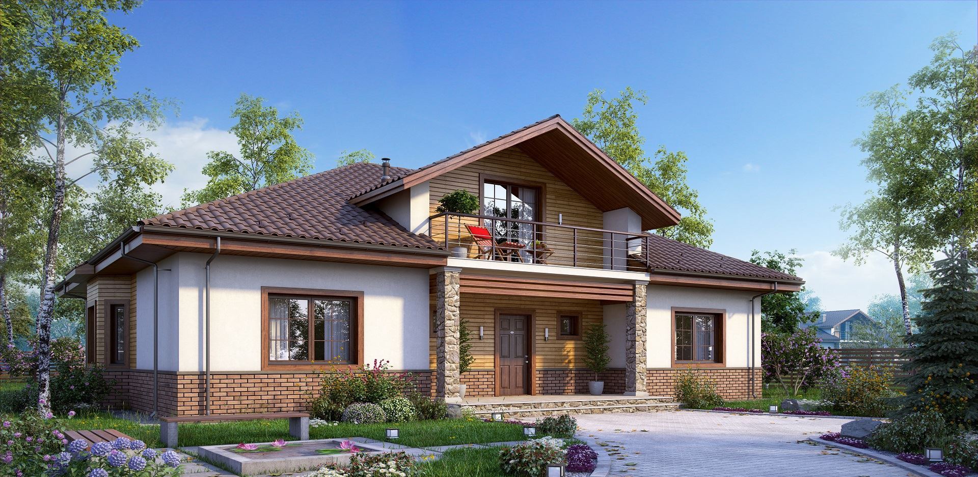 Первый вариант – светлое сооружение с тёмными деревянными балками. Дом с мансардой прекрасно вписывается в ландшафтный дизайн участка. В этом доме могла бы жить семья с детьми. Наличие перед входом в дом просторной террасы, позволит детям играть на ней в любое время года.