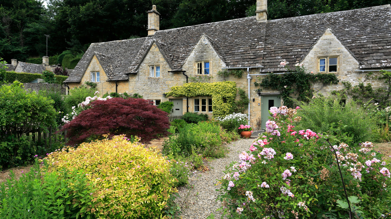 Ключевые элементы. Ландшафт зонируют ровные прямые дорожки, покрытые гравием, деревянной щепой или плиткой, а также низкая деревянная ограда. Дом или другие строения могут украшать вьющиеся растения, например плющ, хмель. В вазонах, кадках и цветниках соседствуют яркие цветы: пионы, флоксы, гортензии, душистый табак, нарциссы. На участке высаживают плодовые деревья, съедобные и ароматные травы: шалфей, лимонник, майоран.