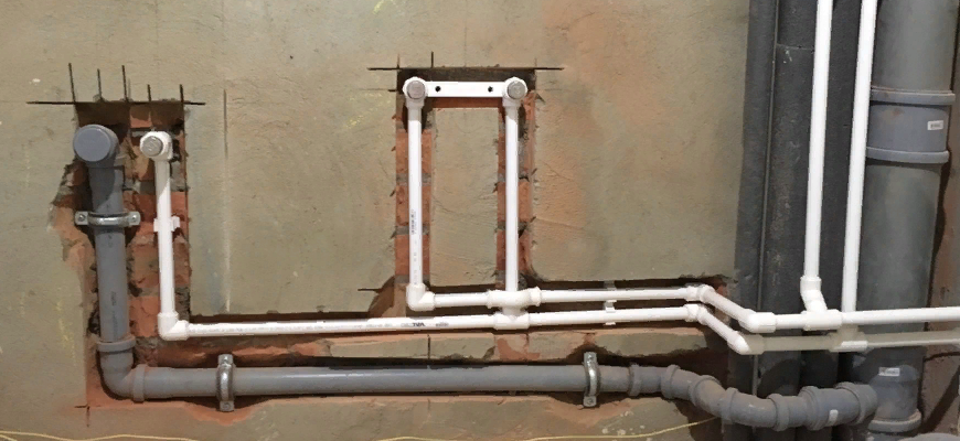 При разводке в раздельном санузле в стене прорезают отверстие, необходимое для подвода канализационного слива или водопровода к стояку.