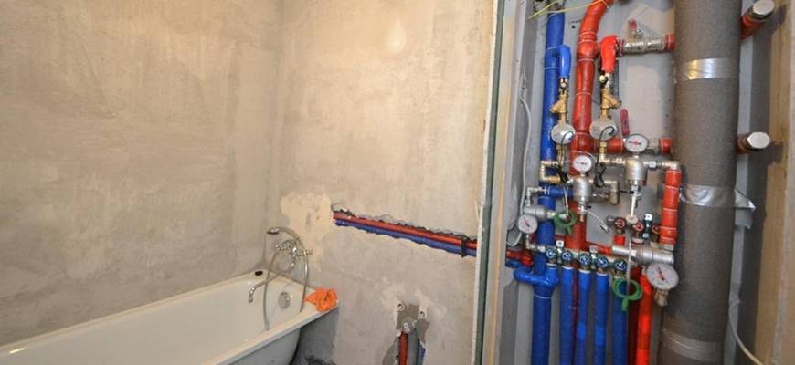 В таком санузле магистрали водоснабжения разводят по стене по периметру помещения от стояка через прорезанные каналы. На местах подключения потребителей предусматривают муфты.