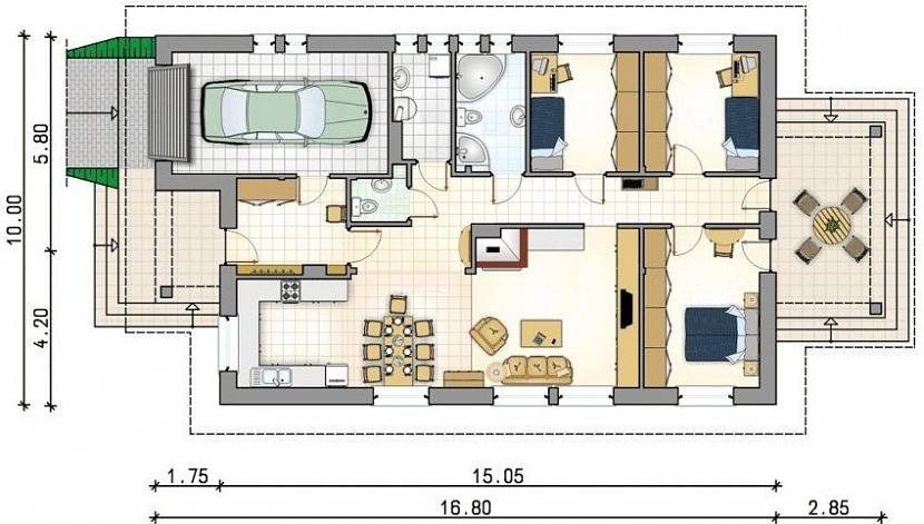 - Оптимальное количество комнат. Проектировщики знают, что, чем больше комнат в одноэтажной постройке, тем сложнее их расположить без использования коридоров (съедающих полезную площадь) и проходных комнат.