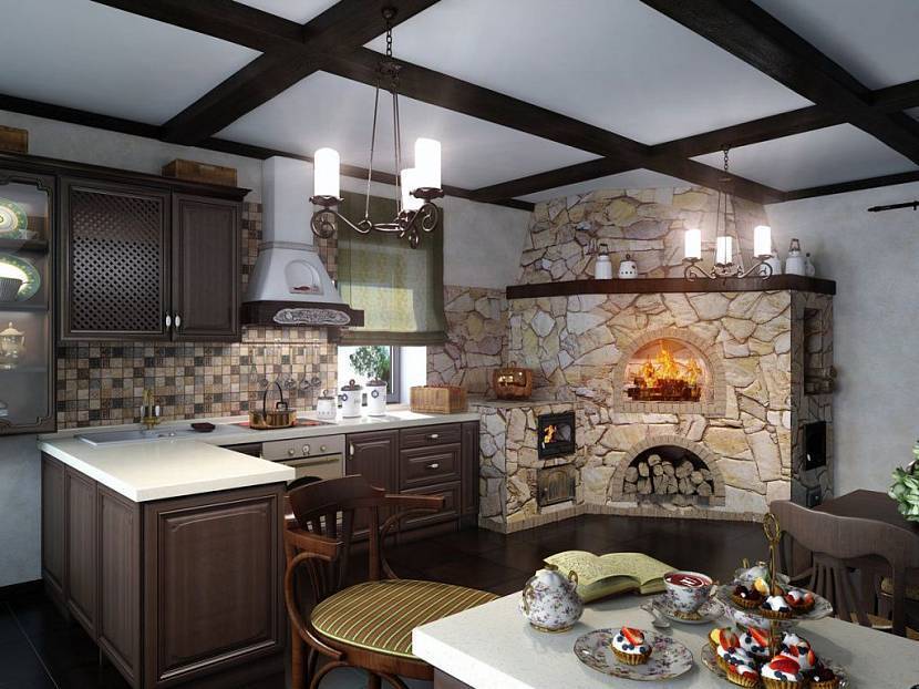 Пример современного дизайна интерьера кухни с небольшой печью в углу Будет просто замечательно, если на кухне, ещё на стадии проектирования дома, предусматривалось наличие больших окон, которые будут пропускать большое количество естественного света. Для оформления этой зоны отдыха можно использовать цветы в горшках и вазах, небольшие картины в деревянных рамках, посуду, расписанную под гжель и хохлому. Если размеры кухни позволяют, то около одной из стен можно поставить шкаф с полками, где будут храниться сервизы с посудой.