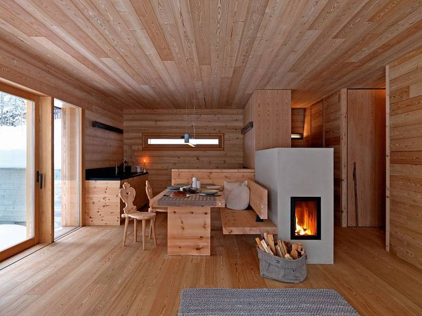 В этом бревенчатом доме две смежных комнаты – спальня и гостиная, в которой обустроена кухня-столовая. Домашний очаг в простенке отапливает все четыре помещения, включая прихожую и санузел. Лежанка выведена в спальню, где служит местом отдыха и увеличивает теплоотдачу отопительного устройства, долго оставаясь теплой.