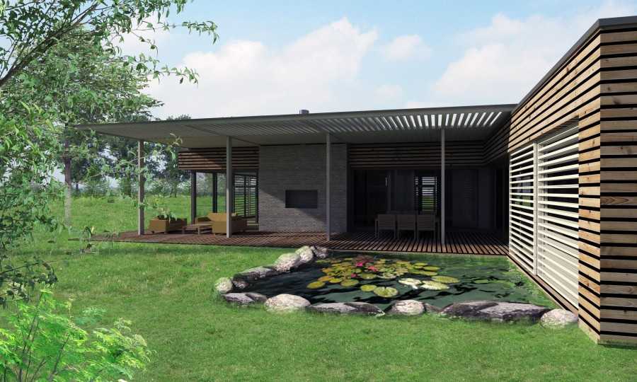 Компоновка и эскизный проект одноэтажного домаЭкстерьер дома в стиле минимализмОдноэтажный дом с террасойЭкстерьер маленького деревянного дома