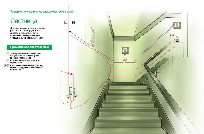 - На лестнице. Это отличное решение для многоквартирных домов, частных коттеджей, имеющих несколько этажей. Расположить такие выключатели можно на всех или нескольких этажах. Пользователь может включить свет на площадке, зайдя в дом, и выключить его перед входом в квартиру на своем этаже.
