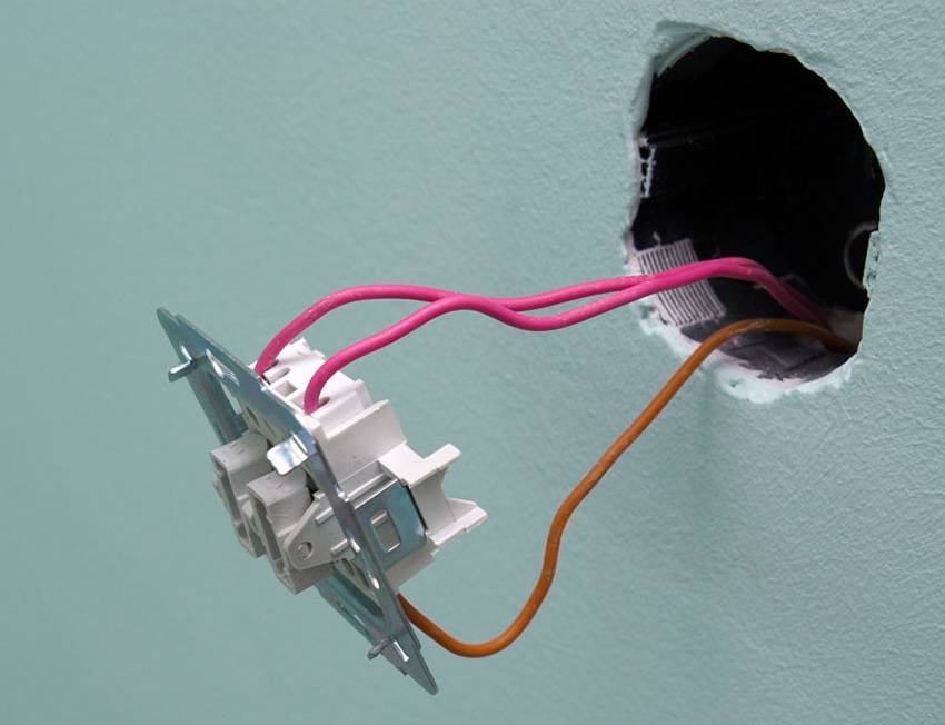 - Свертка проводов аккуратно укладывается в подрозетник, после чего устанавливается механизм переключателя, рама и крышка защитного корпуса.