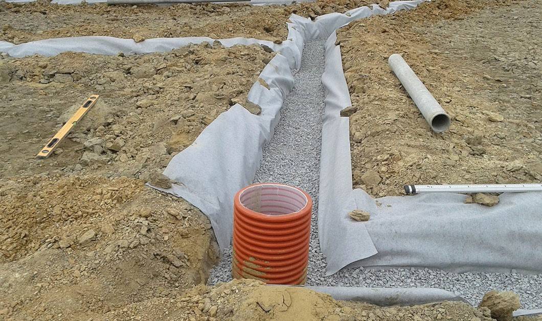 Прокладка траншеи ливневой канализации требует серьезного уплотнения почвы. Таким образом, предотвращают вымывание коммуникаций во время дождей. Дно траншеи засыпают и плотно утрамбовывают слоем песка высотой 15 см. Трубы сверху также покрывают слоем песка.