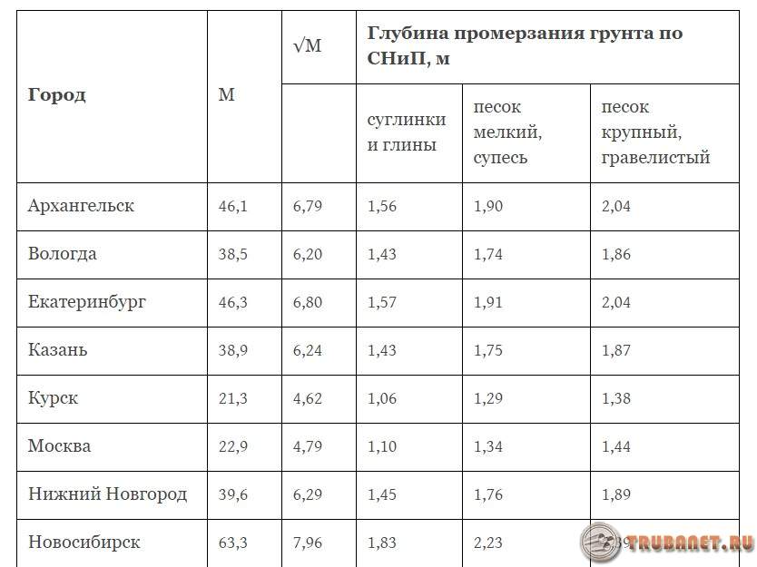 Один из главных параметров при укладке труб – это определение глубины траншеи. При этом учитывается уровень промерзания грунта в зимний период, который в соответствии с нормами должен быть выше глубины промерзания почвы на 30-50 см, от поверхности земли до верха трубы –