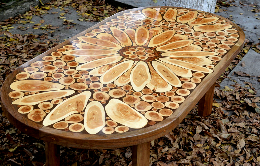 Изготовление изделия подразумевает соединение отдельных деталей между собой смолой. Вариантов может быть большое количество по оформлению. Самые распространённые виды дизайна древесина посередине либо по краям.