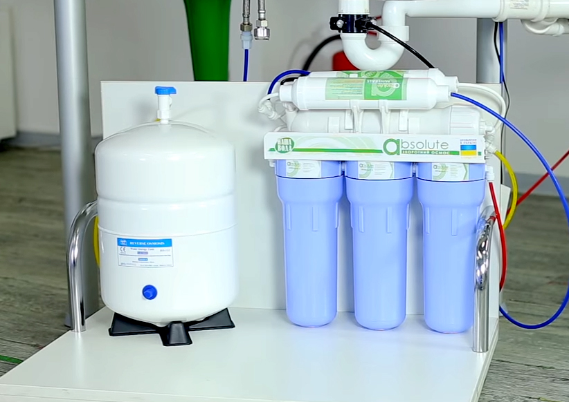 Эта система схожа с проточной, главное отличие — после нескольких степеней очистки вода проходит последнюю, оснащённую мембраной с микропорами. Поры у этой мембраны настолько малы, что пропускают только молекулы воды. В итоге вода лишается абсолютно всех примесей как вредных, так и полезных. Поэтому в комплект некоторых обратноосмотических фильтров может входить специальный минерализатор, который насыщает воду необходимыми для организма элементами. Это повышает стоимость данного прибора.