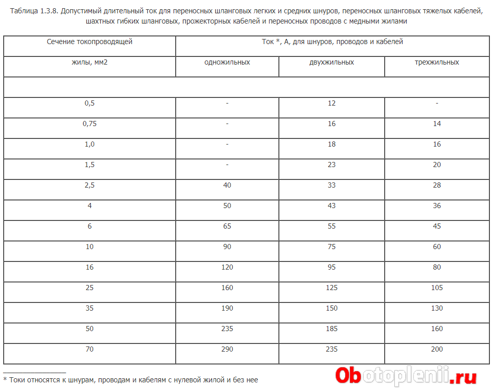 Величина тока при прохождении через проводник в условиях комнатной температуры зависит от ширины, длины, удельного сопротивления и температурного режима. В квартирах и домах чаще всего используют медный провод, поэтому при подборе сечения ориентируются на данные ПУЭ.