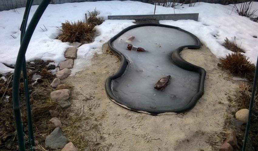 Единственная серьезная неприятность, которая непременно возникнет, если водоем останется зимовать в почве – гибель зимой лягушек. Дело в том, что осенью эти земноводные подбирают себе водоемы для зимовки, а в садах выбор лягушек падает на искусственный пруд. Но из-за того, что вода там полностью промерзает, лягушки гибнут, и весной приходится заниматься не самым приятным делом — вылавливать погибших земноводных из пруда.