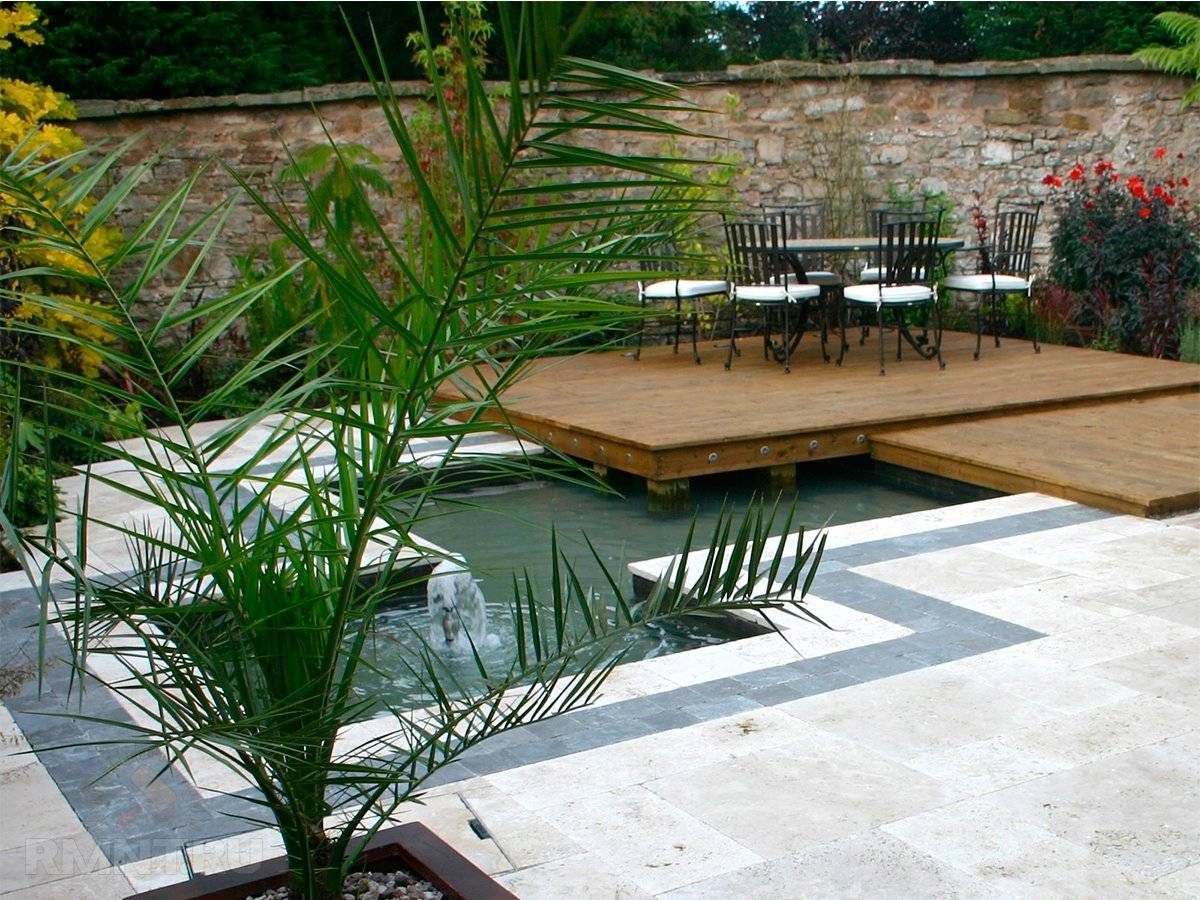 Пруды с правильной геометрией могут быть выполнены над уровнем земли: такой тип прудов минимизирует земляные работы при их устройстве, упрощает уход за ними, снижает риски падения в него маленьких детей. Выступающие над землей бортики такого пруда подойдут для цветника, на них можно установить сиденья, а в самом пруду — устроить фонтан.