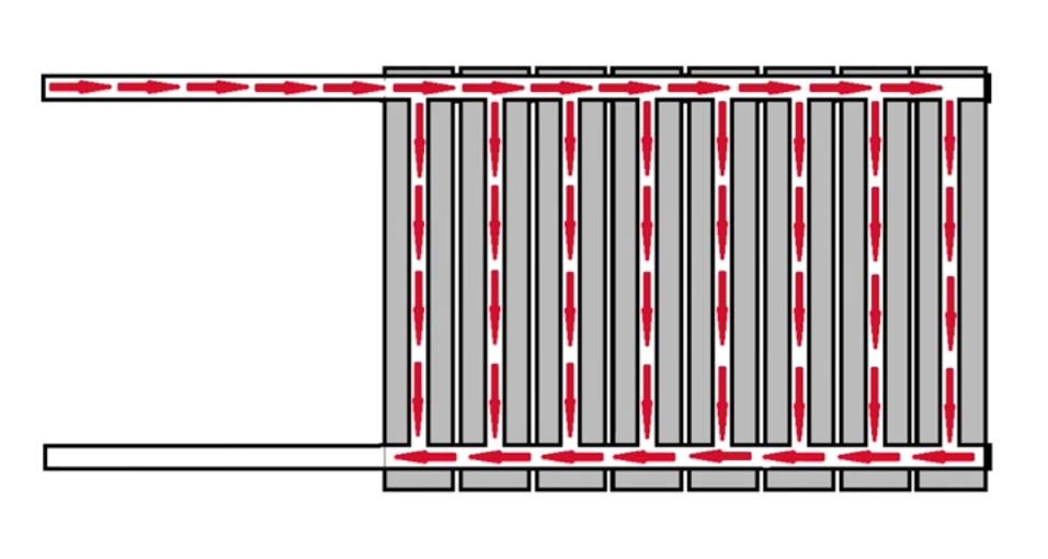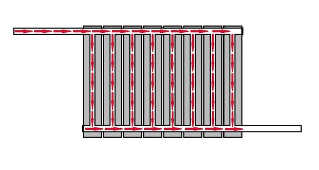 Схема прибора представляет собой монолитную конструкцию, в которой стыковочные штуцеры секций запрессованы в ответные гнезда коллекторов, а сами секции за счет выштампованных защелок жестко соединены с коллекторами.