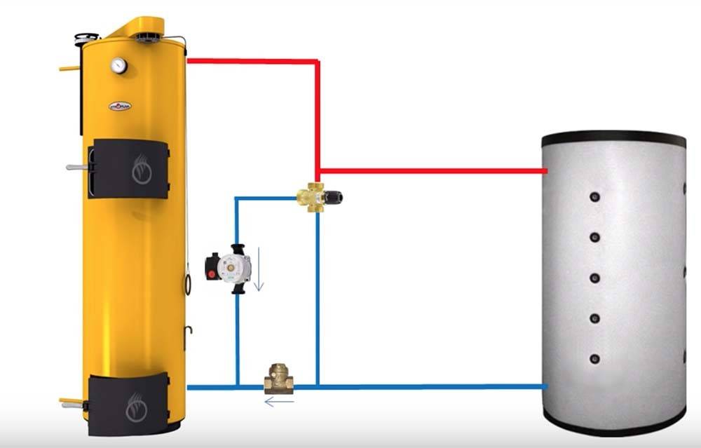 Представим смоделированную ситуацию. Встроенный лепестковый клапан выставим на срабатывание при достижении температуры 55 градусов. При запуске котла вода в системе не нагрета и пока она холодная, клапан закрывается и пускает носитель по малому кругу. После того, как подаваемая вода нагрелась до порогового значения 55 градусов, клапан приоткрылся и начал подмешивать охлажденную воду из обратки. На следующем этапе нагревается вся бочка, при этом температура обратки также поднимется выше 55 градусов. В этот момент клапан полностью переключится и пустит воду по большому кольцу.