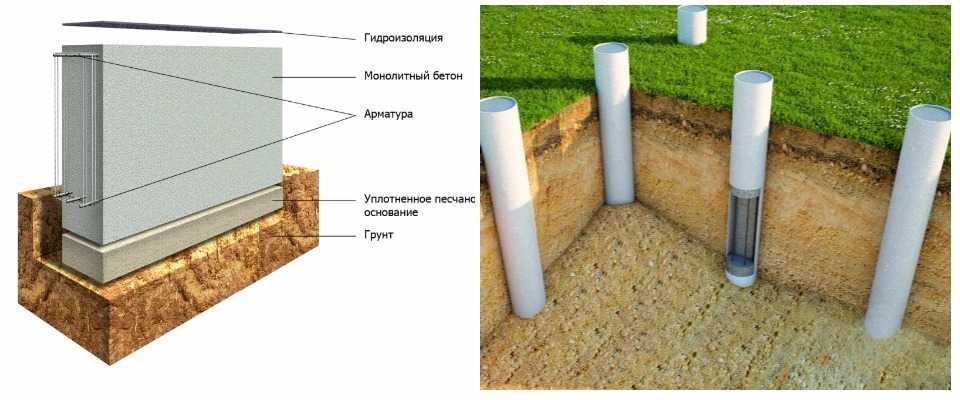 Ленточный и столбчатый фундамент.