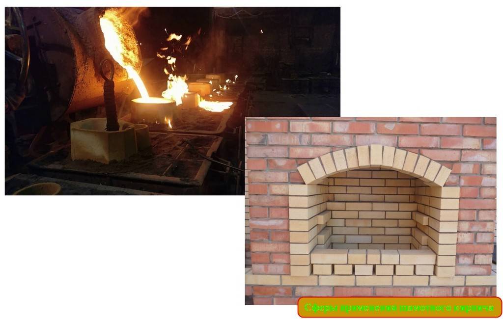 Печи и камины из шамотного кирпича не ограничивается частными капризами. Из шамотного кирпича строят и промышленные топки. Используют кладку огнеупорного шамотного кирпича при обжиге керамики. А кона становится прочной при температурах от 800 до 1100 °С. Шамотный кирпич легко переносит такую температуру. Кстати со стекольным производством дела обстоят примерно также. Там кладка из шамотного кирпича помогает экономить, кирпич снижает теплопотери, экономия топлива в 30% очевидна.