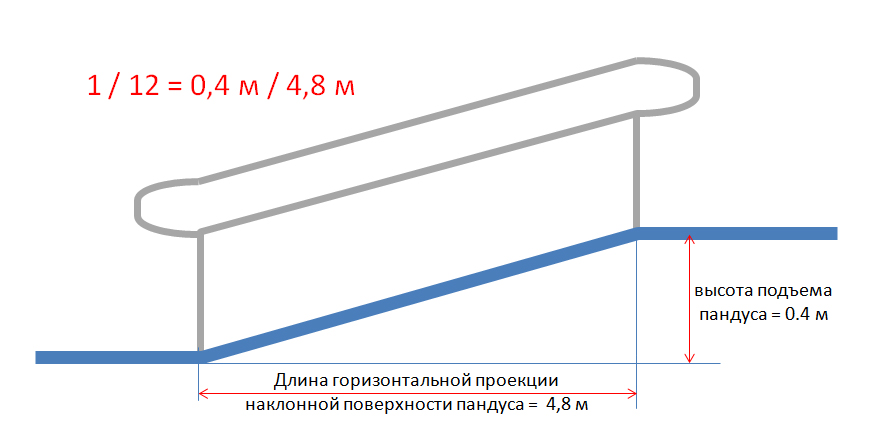 уклон пандуса – 1:12 (или 8%, или 4,76 градуса).