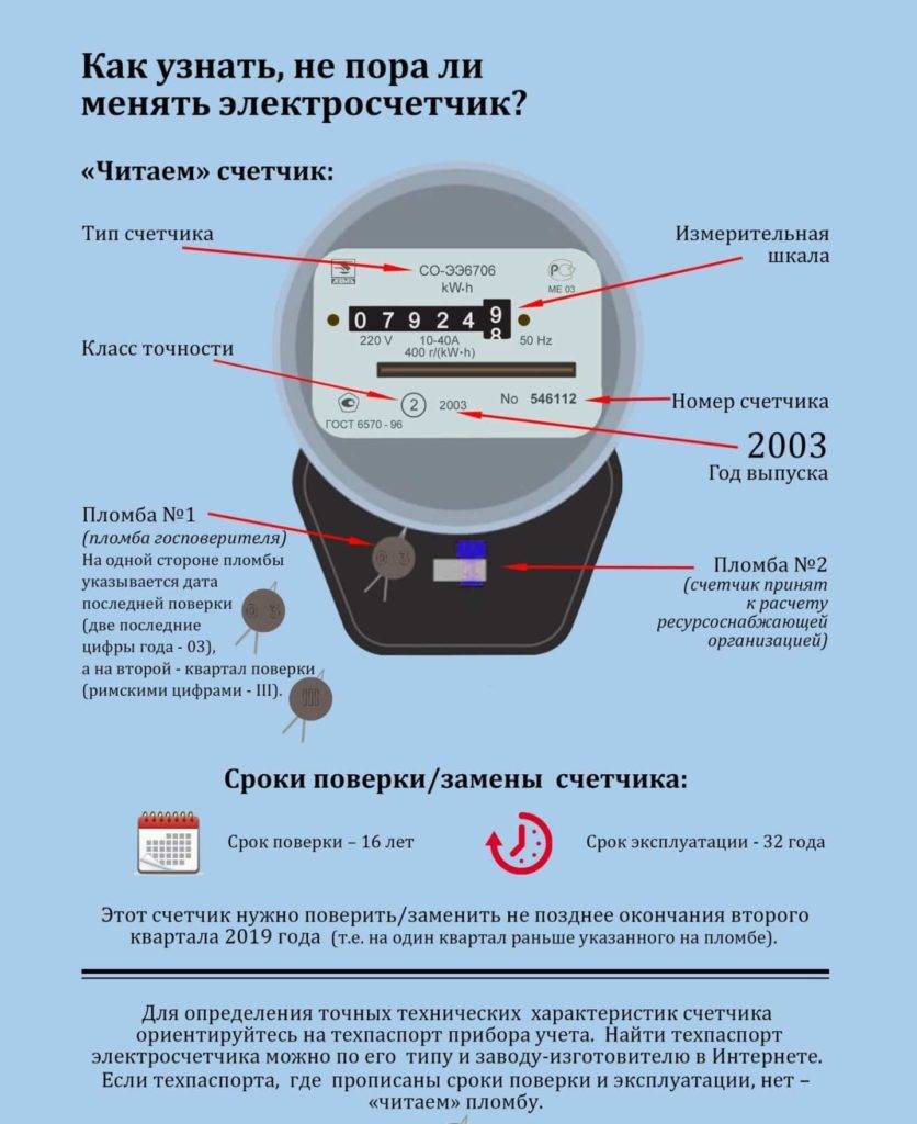 Если подошел срок поверки, нужно сообщить об этом в организацию, поставляющую электроэнергию. Они либо проведут поверку (за свой счет), либо заменят счетчик.