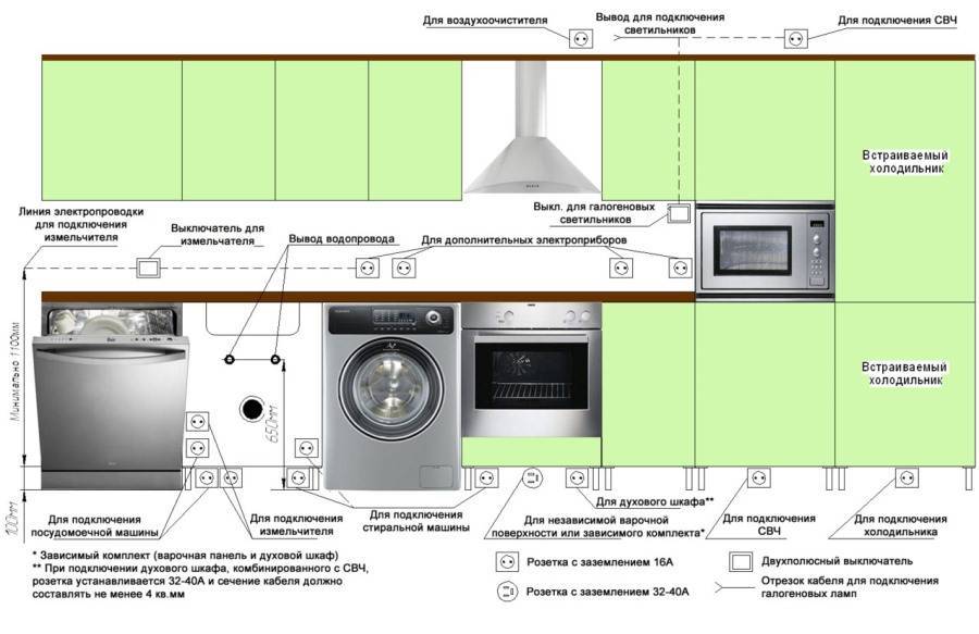 - Электророзетки, предназначенные для встроенной техники, следует разместить за соседними шкафами, поскольку включать такие электрические приборы непосредственно напротив их задней панели запрещено.