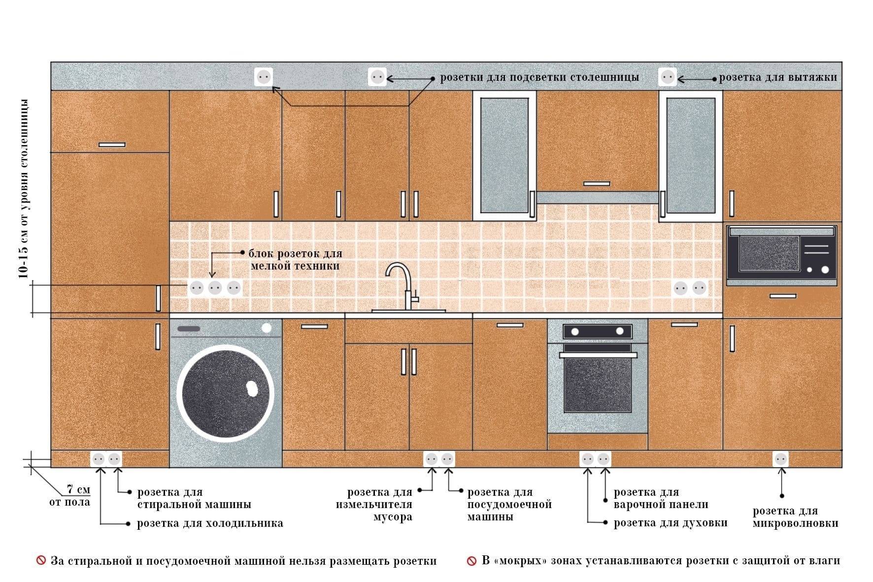 Запрещено монтировать электророзетки непосредственно за корпусом любой встроенной техники, за мойкой или за выдвижными ящиками. Особенно этот запрет актуален для посудомойки и стиральной машины.